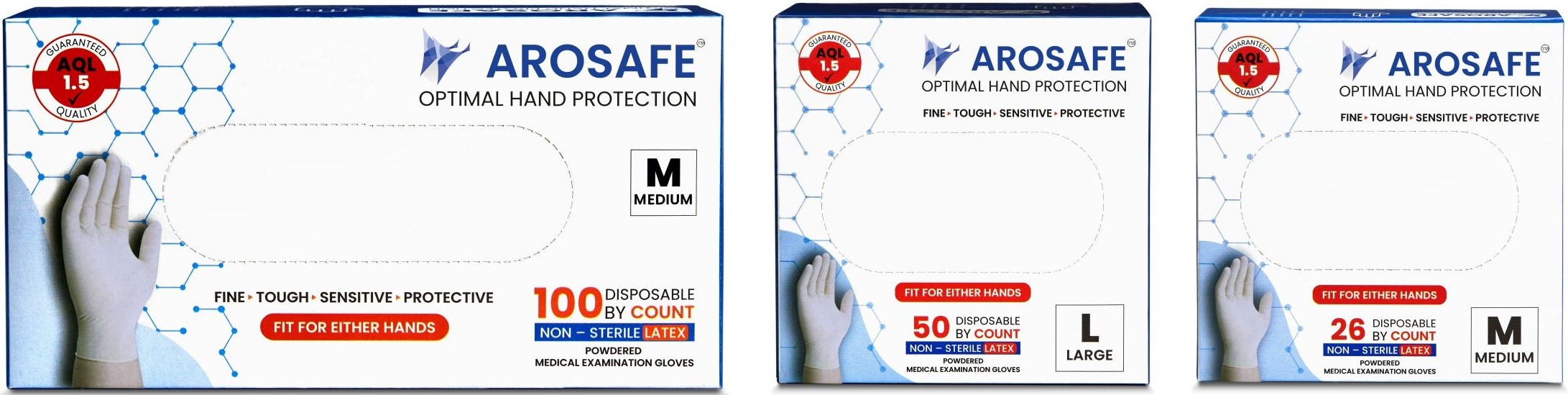 AROSAFE Latex examination Gloves Manufactured in India under state of Art manufacturing Process, provides Optimal Protection to Hands and avoids cross contamination. Specially designed for conducting medical examinations, diagnostics and therapeutic procedures.